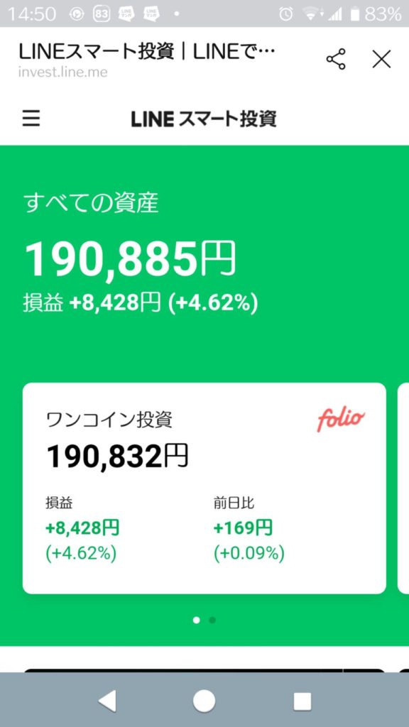 2020/12/03LINEスマート投資 LINEスマート投資 2020.12.03 2020/12/03LINEスマート投資の結果です。 今日は上がりました。ちなみに昨日の結果は見損ねてしまいました。ドンマイ。なかなか損益が1万に達しないなぁ。多少増えてはいるのでしょうが、なかなか実感できません。少しずつでもいいので上がっていって欲しい今日この頃です。